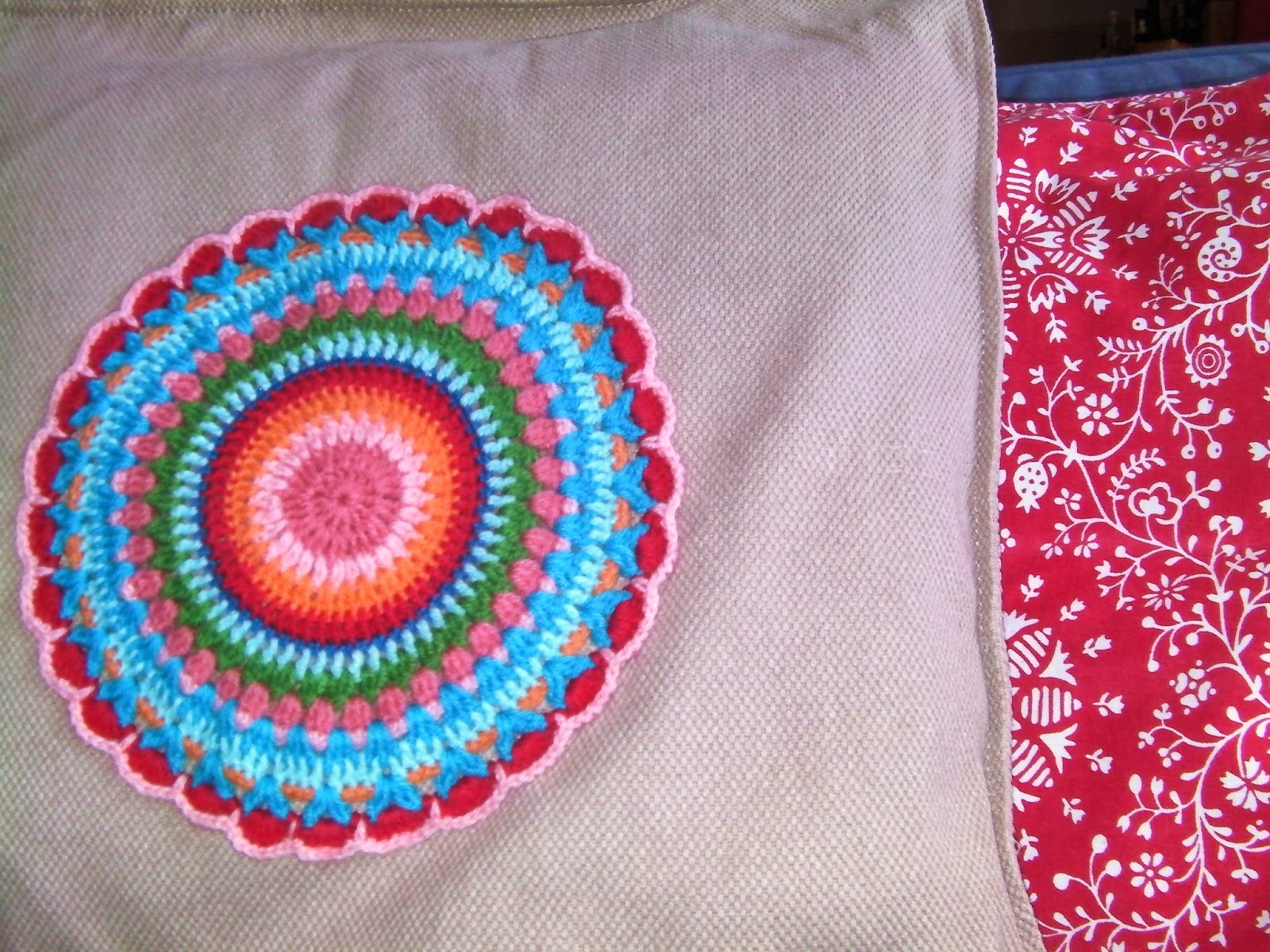 Aqui está uma das mandalas que tinha feito em Maio. Hoje peguei nela e dei-lhe um destino: decidi aplicá-la numa almofada bege que andava cá por casa.
