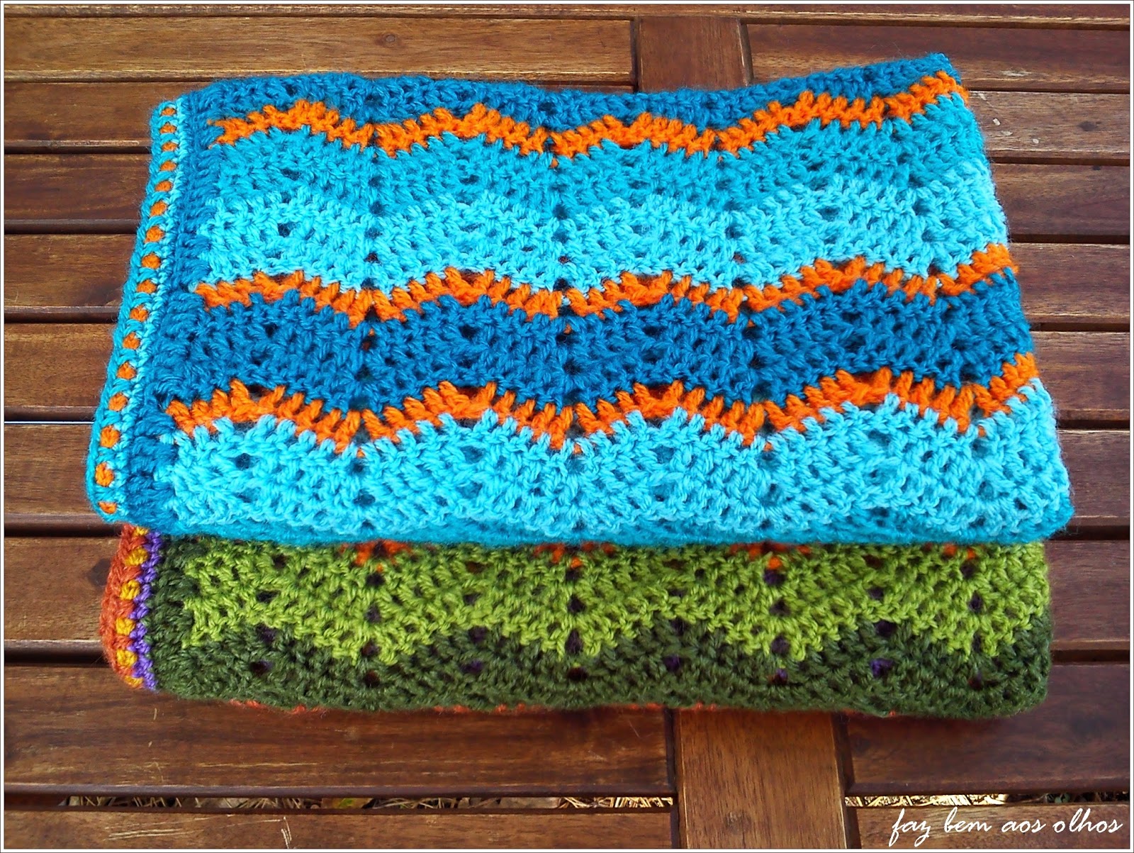 Cá estão elas - as minhas pequenas - finalmente terminadas. Duas mantas tamanho S com padrão ripple ou zig-zag. Como habitualmente, não fiz cerimónias nos contrastes e penso que o resultado é muito feliz. Os meus olhos gostam!