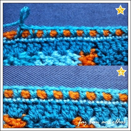 por fim, pegam noutra cor e terminam com mais uma carreira em ponto baixo, também intercalado mas desta vez o ponto é trabalhado no intervalo dos pontos da carreira anterior (imagem 5). Et voilá! o efeito é muito bonito e confere ao trabalho um acabamento resistente (imagem 6).
