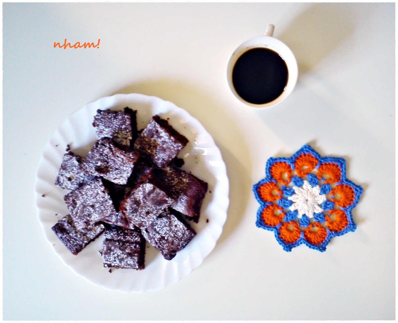 Tudo isto aconteceu no sábado. Entretanto chegou domingo. Meninos ainda com os avós. Dormir até mais tarde, levantar devagar, tomar o café (duplo) da manhã, festinhas à Helga (a cadela), festinhas às gatas... passa a manhã, chega a tarde e é dia de fazer zapping! Fórmula: café acabado de fazer (de saco, é o meu preferido), um prato de brownies feitos pelo pai R, um sofá confortável e o comando na mão. O crochezinho foi só para ficar bem na fotografia :)
