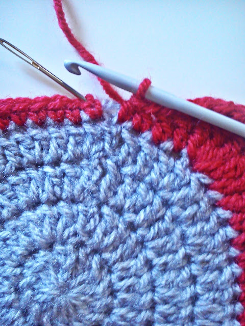 Antes de começarem com a nova cor, a que vai criar a forma do quadrado, sugiro que primeiro rematem as pontas de fio do círculo. Com uma agulha de coser lã, passem a ponta para o lado de dentro e rematem essa e a do início. Outra dica, sempre que começamos uma carreira com ponto baixo, o primeiro ponto deve ter duas malhas de cadeia, de forma a que quando se feche a volta esse ponto não fique repuxado.